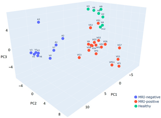 The 3D principal component analysis diagram of protein distributions for the MRI-positive epilepsy patients, MRI-negative epilepsy patients, and the healthy group. Point labels are described in the footnote to Table 1.