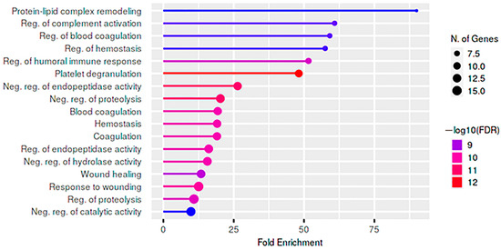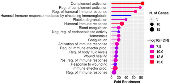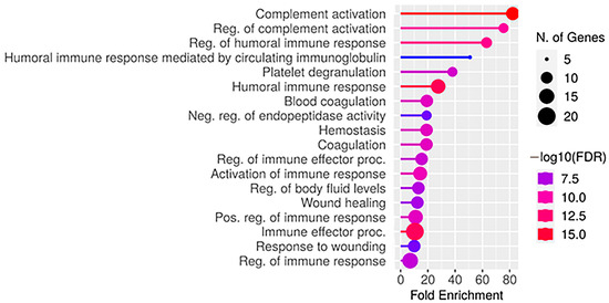 For these groups, a list of 46 significantly altered proteins was obtained (Table S2). Eleven proteins were found to be upregulated in the MRI-positive group. The GO analysis revealed the involvement of these proteins in the list of biological processes (Figure 3). Most of the overrepresented MRI-positive group proteins are involved in the regulation of the immune response.