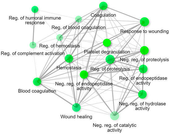 The majority of the proteins with an altered expression found by the comparison of epilepsy and healthy plasma proteomic profiles are involved in immune response processes, lipid metabolism, and the regulation of peptidase activity (Figure 5). The process of epileptogenesis causes massive changes in cellular and molecular processes, as evidenced by the aberrations of proteins involved in various mechanisms. Epilepsy does not cause strictly specific dysregulations. Biochemical cascades triggered by an attack lead to changes in various biological and molecular pathways, that are not direct factors in the development of the disease.