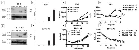 Immunoblot detection of PR-A and PR-B exhibited almost undetectable signals in both ES-2 and TOV-21G wild-type cells, as illustrated in Figure 2A,B. Following transfection with plasmids pcDNA3-vector, pcDNA3-PR-A or pcDNA3-PR-B, immunoblotting revealed approximately a 5-fold increase in PR-A protein expression in both ES-2-PR-A and TOV-21G-PR-A over-expression cells when compared to ES-2- and TOV-21G-vector cells, while ES-2-PR-B- and TOV-21G-PR-B-overexpressing cells also exhibited a significant elevation (about a 14-fold increase) in PR-B protein levels relative those of ES-2- and TOV-21G-vector cells (Figure 2C,D). Cell viability assays indicated that ES-2 cells overexpressing PR-A and PR-B displayed significantly slower proliferation rates than cells transfected with vector only, while statistical significance was only observed in PR-B-overexpressing TOV-21G cells (Figure 2E,F). Furthermore, the cytotoxic effects of cisplatin on ES-2 and TOV-21G cells with varying PR-A and PR-B expression levels were assessed. The IC50 (50% inhibitory concentration) values of cisplatin in our cell lines were determined to be 3.34 μM for both ES-2 and TOV-21G. As compared to the control (vector) cells, cisplatin-induced inhibition of proliferation was significantly pronounced in both PR-A- and PR-B-overexpressing ES-2 cells (Figure 2G). Similar results were noted in TOV-21G cells, with an exception that only PR-B-overexpressing cells exhibited significantly slower proliferation rate at 96 h compared to vector cells (Figure 2H). We observed a greater improvement in chemosensitivity in the ES-2 cell line compared to TOV-21G (Figure 2G,H), suggesting that the overexpression of PR may enhance drug sensitivity more in chemo-resistant cells such as ES-2.