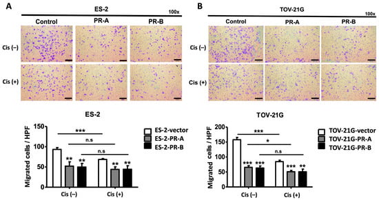 The migration assay conducted on ES-2 (A) and TOV-21G (B) cells utilizing the Transwell system revealed that PR-A- and PR-B-overexpressing cells exhibited reduced migration ability compared to vector cells. Upon treatment with cisplatin (Cis), the metastatic capacity was further inhibited in cells overexpressing PR-A or PR-B. Statistical significance is indicated by * for p < 0.05, ** for p < 0.01, *** for p < 0.001, and n.s. for nonsignificant differences. Scale bar 100 µm.