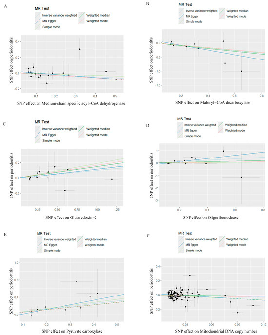 Scatter plots for Mendelian randomization analyses of the causal effect of mitochondrial biological function on periodontitis. (A) Scatter plot of the causal relationship between medium−chain specific acyl−CoA dehydrogenase and periodontitis, evaluated by the IVW method. (B) Scatter plot of the causal relationship between malonyl−CoA decarboxylase and periodontitis, primarily evaluated via the IVW method. (C) Scatter plot of the causal relationship between glutaredoxin−2, mitochondrial and periodontitis, primarily evaluated using the IVW method. (D) Scatter plot of the causal relationship between oligoribonuclease and periodontitis using the IVW method. (E) Scatter plot of the causal relationship between pyruvate carboxylase and periodontitis, primarily evaluated with the IVW method. (F) Scatter plot of the causal relationship between mitochondrial DNA copy number and periodontitis, evaluated using the IVW method. IVW, inverse variance weighting.