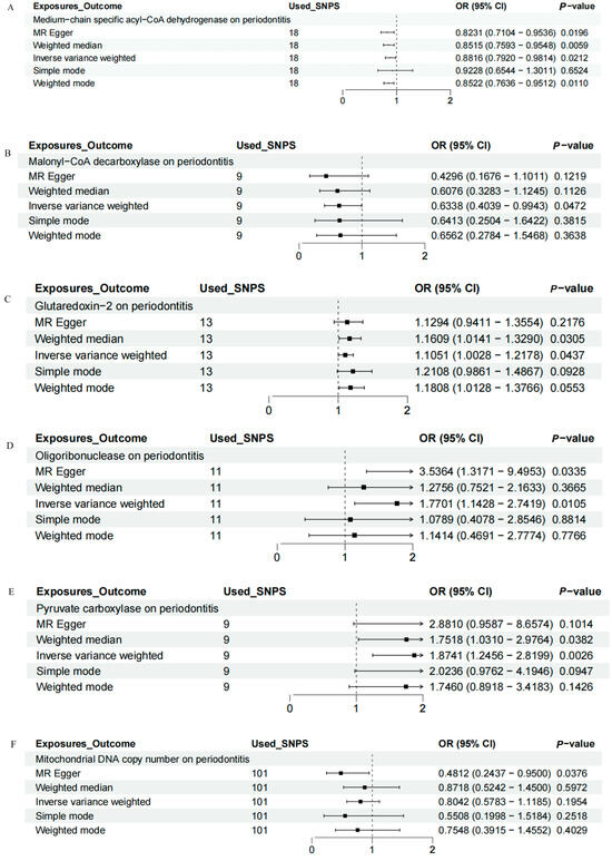 Forest map of the causal relationship between mitochondria and periodontitis (IVW method). (A) Forest map of the causal relationship between medium−chain specific acyl−CoA dehydrogenase and periodontitis. (B) Forest map of the causal relationship between malonyl−CoA decarboxylase and periodontitis. (C) Forest map of the causal relationship between glutaredoxin − 2 and periodontitis. (D) Forest map of the causal relationship between oligoribonuclease and periodontitis. (E) Forest map of the causal relationship between pyruvate carboxylase and periodontitis. (F) Forest map of the causal relationship between mitochondrial DNA copy number and periodontitis. IVW, inverse variance weighting.