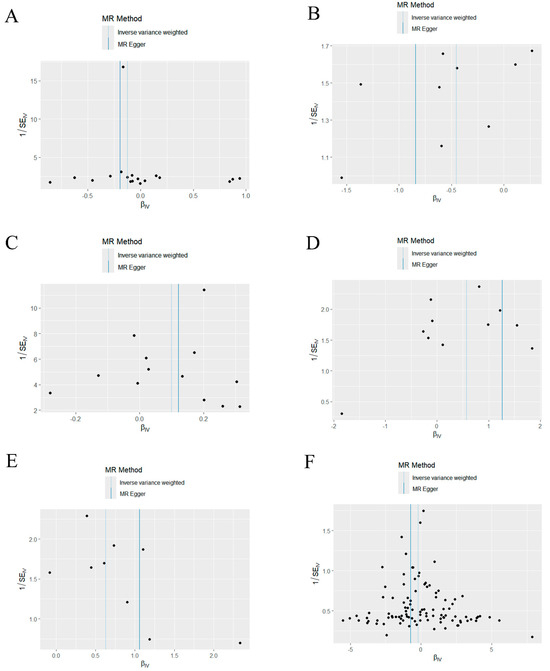Funnel plot of the causal relationship between mitochondria and periodontitis (IVW method). (A) Funnel plot of the causal relationship between medium−chain specific acyl−CoA dehydrogenase and periodontitis. (B) Funnel plot of the causal relationship between malonyl-CoA decarboxylase and periodontitis. (C) Funnel plot of the causal relationship between glutaredoxin− 2 and periodontitis. (D) Funnel plot of the causal relationship between oligoribonuclease and periodontitis. (E) Funnel plot of the causal relationship between pyruvate carboxylase and periodontitis. (F) Funnel plot of the causal relationship between mitochondrial DNA copy number and periodontitis. IVW, inverse variance weighting.