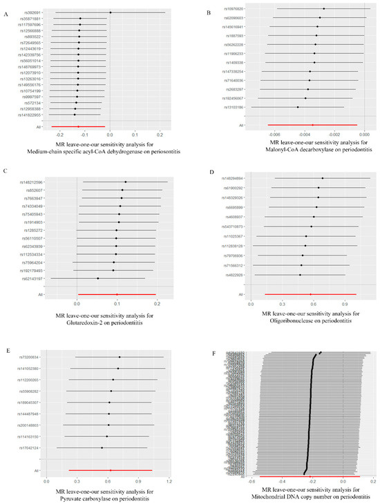 “Leave−one−out” forest map of the causal relationship between mitochondria and periodontitis (IVW method). (A) “Leave−one−out” forest map of the causal relationship between medium−chain specific acyl−CoA dehydrogenase and periodontitis. (B) “Leave−one−out” forest map of the causal relationship between malonyl−CoA decarboxylase and periodontitis. (C) “Leave−one−out” forest map of the causal relationship between glutaredoxin−2 and periodontitis. (D) “Leave−one−out” forest map of the causal relationship between oligoribonuclease and periodontitis. (E) “Leave−one−out” forest map of the causal relationship between pyruvate carboxylase and periodontitis. (F) “Leave−one−out” forest map of the causal relationship between mitochondrial DNA copy number and periodontitis. IVW, inverse variance weighting.