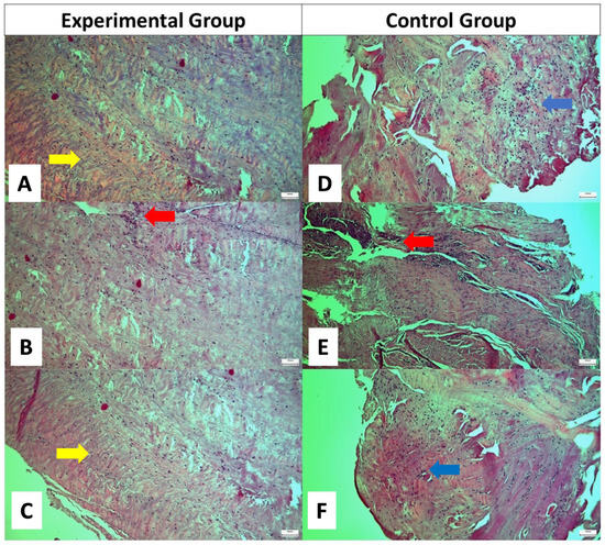 Optical microscopy image of tendon specimens. (A–C) Specimens from three different patients in the experimental group. (D–F) Specimens from three different patients in the control group. In the experimental group, abundant tenocytes lie within parallel, waveform collagen fibers (yellow arrows). A few inflammatory cells are also identified (red arrows). In the control group, collagen fibers yield both parallel and disorganized (blue arrows) distribution with numerus interposed tenocytes. Accumulation of inflammatory cells is marked with the blue arrow. Hematoxylin and eosin staining; original magnification ×100.