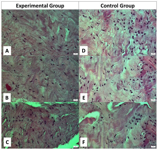 Optical microscopy image of tendon specimens. (A–C) Specimens from three different patients in the experimental group. (D–F) Specimens from three different patients in the control group. In the experimental group, oval-shaped tenocytes are identified within parallel, waveform collagen fibers. In the control group, oval and rounded tenocytes lie within disorganized, disoriented collagen fibers. Hematoxylin and eosin staining; original magnification ×400.