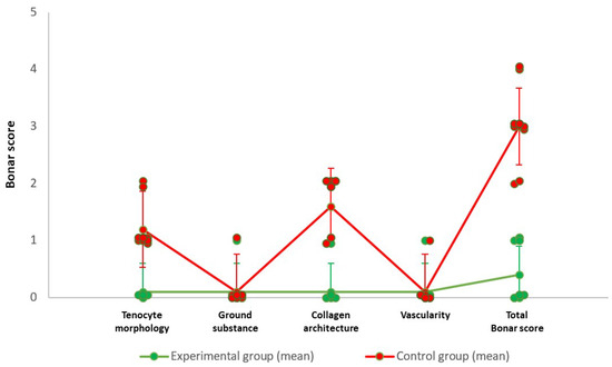 In the optical microscopy scanning, the histopathological assessment included the evaluation of collagen fiber arrangement, cell density and the presence of inflammatory reaction. The Bonar grading system was used as the assessment tool for quantification of tendon morphology. This score considers four parameters: tenocyte morphology, ground substance, collagen architecture and vascularity [45] (Table 3). Each variable is quantified on a scale from 0 to 3 (0 = normal, 1 = slightly abnormal, 2 = abnormal and 3 = markedly abnormal).