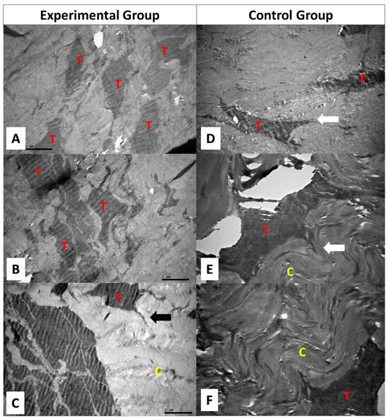 Electron microscopy image of tendon specimens. (A–C) Specimens from three different patients in the experimental group. (D–F) Specimens from three different patients in the control group. In the experimental group, many tenocytes (T) with multiple cytoplasmic processes (black arrow) are identified within parallel collagen fibers (C). Original magnification ×6000 (A,B), ×8000 (C). In the control group, collagen fibers appear in a wavy, parallel orientation (C). Tenocytes (T) with short cytoplasmic processes are distinguished (white arrows). Original magnification ×8000 (A), ×12,000 (B,C).