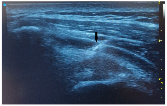 Ultrasound image of the shoulder. After confirmation of the needle tip position in subacromial space (black arrow), PRP injection is carried out.