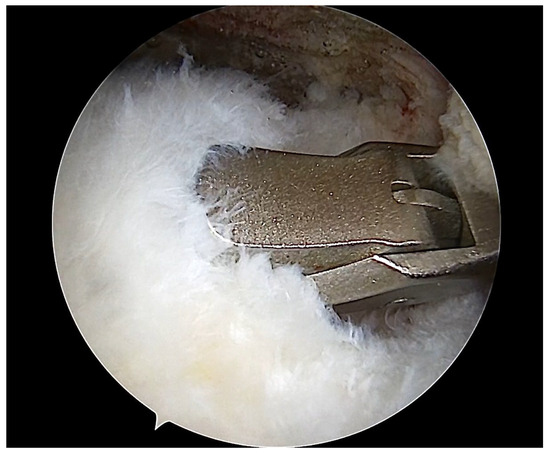 During arthroscopy, a full-thickness supraspinatus tendon specimen sized approximately 3 × 5 mm was harvested from the lateral edge of the tendon tear using a basket punch (Figure 7). The sample was divided into two equal parts. One part, which would be examined under optical microscope, was embedded in sterile 10% formalin solution (out of 35% formaldehyde stock solution). The second part, which would be evaluated by electron microscopy, was sectioned into <0.5 cm3 pieces and placed in glutaraldehyde solution 3%.