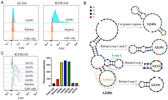 Optimization of the intact A2 aptamer. (A) Flow cytometry analysis of target KYSE410 and control EC109 cells incubated with the intact A2 aptamer. (B) Optimization strategies of the intact A2 aptamer. (C) Flow cytometry analysis of KYSE410 cells incubated with various truncated aptamers of A2. The corresponding quantitative fluorescent intensities were calculated.