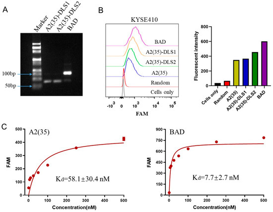 A2(80), A2(40), A2(35), A2(19), A2(12), A2(35)-DLS1, A2(35)-DLS2, and random sequences were separately labeled with an FAM fluorescence group at the 5’ end for flow cytometry analysis. Generally, KYSE410 or EC109 cells (approximately 1 × 105) were mixed with different probes (250 nM) in a binding buffer for 30 min on ice. After incubation, cells were washed with the washing buffer for 3 times and resuspended in 400 μL of the binding buffer for flow cytometry analysis. The data were processed by Flowjo 7.6 software. To determine the dissociation constants (Kd) of A2(35) and the BAD to KYSE410 cells, different concentrations (0, 10, 25, 50, 100, 200, and 500 nM) of A2(35) or the BAD were separately mixed with KYSE410 cells, and the fluorescence values of their binding were detected by flow cytometry. Kd was calculated by Y = Bmax X/(Kd + X) using GraphPad Prism 8 software, where X represents the probe concentration and Y represents the fluorescence value.