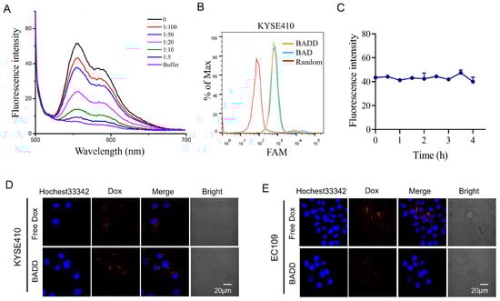 Construction and selective internalization of the BADD. (A) Fluorescence spectra of the BADD with different ratios of the BAD to Dox. The Dox concentration was fixed at 10 μM. (B) Binding abilities of the BAD and the BADD to target KYSE410 cells analyzed by flow cytometry. 250 nM of the BAD or the BADD was incubated with KYSE410 cells for 30 min. (C) Stability analysis of the BADD in a serum-free medium by detecting Dox fluorescence at different times. Internalization of the BADD to target KYSE410 cells (D) and control EC109 cells (E) were visualized by confocal imaging. 2 μM of the BADD was incubated with the cells for 2 h in a serum-free medium. Dox fluorescence was displayed in red. Cell nuclei were stained with Hochest33342 (blue). The scale bar is 20 μm.