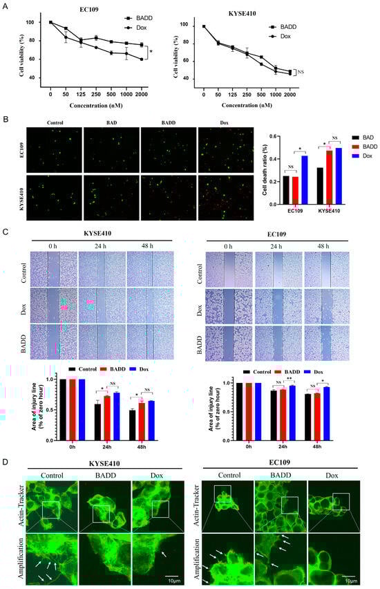 To evaluate BADD-induced selective killing of target cells, CCK-8 analysis was performed to detect cell viability. As shown in Figure 5A, the cell viability of control EC109 cells treated with the BADD was significantly higher than that of EC109 cells treated with free Dox, and the cell viabilities of target KYSE410 cells treated with the BADD and free Dox were similar. These results indicated that the BADD can selectively kill target cells, but not control cells. Calcein AM/PI staining was further performed to verify BADD-induced selective killing of target cells. Target KYSE410 and control EC109 cells were treated with the BAD, the BADD, and free Dox, respectively, and the corresponding cell death ratios were calculated. The results (Figure 5B) showed that the cell death ratios of EC109 cells treated with the BAD and the BADD, respectively, were significantly lower than that of EC109 cells treated with free Dox, while the cell death ratio of KYSE410 cells treated with BADD and free Dox were similar, suggesting that Dox can non-selectively kill KYSE410 and EC109 cells while the BADD can selectively kill target KYSE410 cells. Moreover, wound healing analysis was also performed to validate this effect. After the target KYSE410 and control EC109 cells were treated with free Dox and the BADD for 2 h in a serum-free medium and for 24 and 48 h in a complete medium, the corresponding wounded areas were measured. As shown in Figure 5C, the wounded areas of KYSE410 cells treated with free Dox and BADD were similar, while the wounded area of EC109 cells treated with BADD was lower than that of EC109 cells treated with free Dox, indicating that BADD can specifically inhibit target cell growth and migration. Lamellipodia can promote cell migration, which is usually used as the hallmark of migrating cells [22]. Therefore, lamellipodia imaging was performed to verify BADD-induced changes of cell migration ability. As shown in Figure 5D, almost no lamellipodia was observed on the target KYSE410 cells treated with the BADD compared to that on the control, while obvious lamellipodia could be observed on the EC109 cells treated with the BADD, which further verified that the BADD can specifically inhibit target KYSE410 cell growth and migration, but not control EC109 cells. The above results demonstrated that the BADD can selectively inhibit cell growth and may be used as an effective therapeutic reagent for targeted chemotherapy of ESCC.