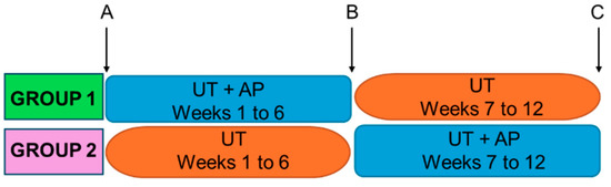 Group 1 performed AP combined with UT for the first six weeks of the intervention, while Group 2 performed the combined AP and UT program throughout the last six weeks (Figure 1).