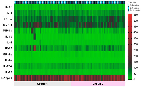 Interestingly, using multiple comparison tests, the most pronounced differences in Group 1 were observed in IL-8, IL-12p70, and MCP-1 levels at time point C versus point A. Only cytokine IL-12p70 levels significantly decreased in this group at time point B compared to time point A (Table 2).