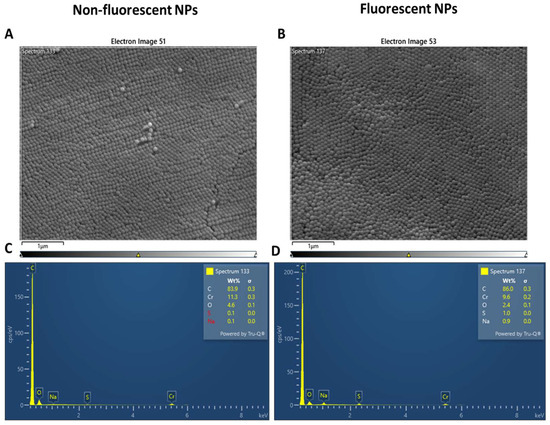 Electron microscopy was used to characterize PSNPs. PSNPs had an average size of 100 nm, according to the manufacturer’s specifications (Figure 1A,B). Energy dispersive X-ray analysis (EDX) was used to confirm the absence of metals or other contaminants. The spectrum reveals only the presence of carbon, confirming the purity of the solution and the presence of oxygen due to the presence of water residue. Chromium is added to perform SEM analysis, and Na and S are needed as preservatives (Figure 1C,D).