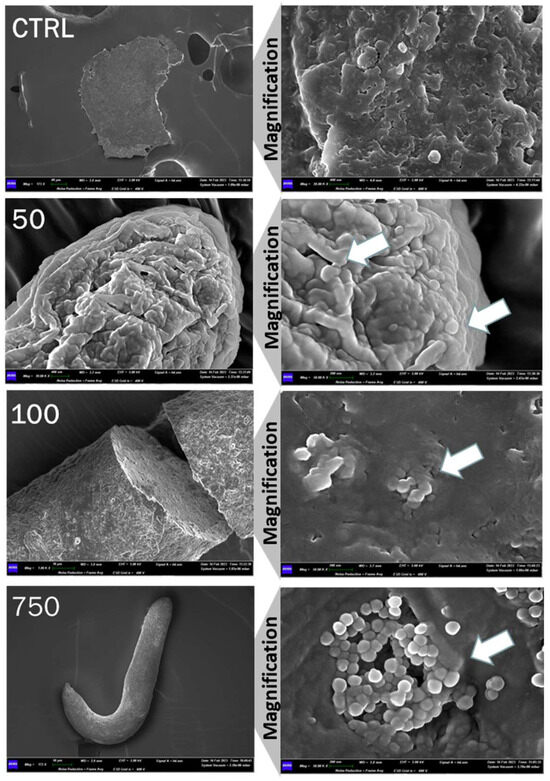 SEM analysis of PSNPs in feces from untreated flies (CTRL) and three different concentrations (50 μg/mL, 100 μg/mL, and 750 μg/mL). Left column has 172 X magnification for CTRL and 750 μg/mL, 20.00 K X for 50 μg/mL, and 1.00 K X for 100 μg/mL; the right column magnification is 50.00 K X for every condition. White arrows point to NPs.