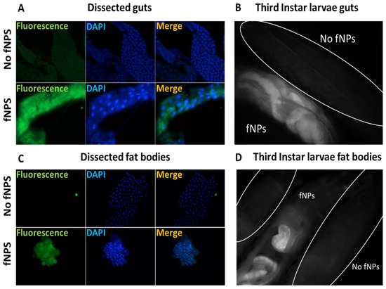 The ingestion of fluorescent PSNPs (fPSNPs) allowed the study of the biodistribution of plastics in larvae. Live and dissected OR-R larvae were observed under a fluorescence microscope (Figure 3). In living larvae, ingested fPSNPs are found in the gut (Figure 3B) and in body structures that are likely to be fat bodies. The analysis of dissected larvae confirms the presence of fNPs in guts and fat bodies (Figure 3A,C). The noticeable presence of PSNPs in fat bodies is probably due to the lipophilic nature of PSNPs (Figure 3D) and is indicative of the passage of PSNPs across the intestinal barrier and their release in the haemolymph (the fly blood).