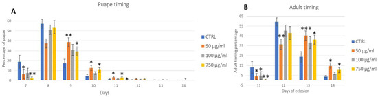 Analysis of development traits of OR-R flies: pupae formation (A) and adult timing (B). Treatments: Control (0 µg/mL); 50 µg/mL, 100 µg/mL, 750 µg/mL. * p < 0.05; ** p < 0.005; *** p < 0.001.