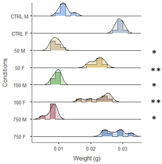 Considering the delay in larvae–pupae development, the weight of adults was investigated. Figure 5 shows that the weight of treated male and female adults was significantly reduced with respect to the untreated flies.