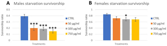 Starvation assay with OR-R flies. Three days-old adults chronically exposed were starved in empty vials and checked hourly for the first 12 h (Figure S2A,B Supplementary Materials) and after 24 h (A,B). Treatments: CTRL (0 µg/mL); 50 µg/mL; 100 µg/mL; 750 µg/mL. * p < 0.05; *** p < 0.001.