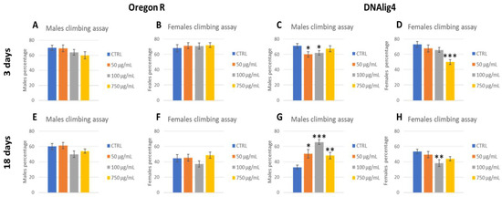 We performed a standard climbing assay on OR-R and DNAlig4 defective mutants following the Iuso et al. protocol with some modifications [92]. We collected 3- and 18-days old individuals and divided them into males and females. The experiment with the OR-R was repeated three times, scoring 50 males and 50 females each (300 flies for every concentration) grouped ten by ten in empty vials. The DNAlig4 experiment was repeated six times, scoring 50 males and 50 females each (600 flies in total). The assay consisted in measuring how many flies could reach a height of 7 cm in 20 s after being tapped down. The 3 days old and the 18 days old flies were the same; eventually, dead individuals were scored too.
