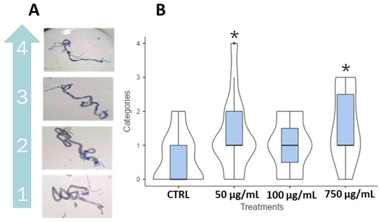 We performed the Trypan blue assay as a first sight into gut damage in larvae. We followed the Carmona et al. (2015) protocol with some light modifications [96]. Wild-type third instar larvae grown in four concentrations (0, 50, 100, and 750 μg/mL) were collected and washed three times in PBS. Then, guts were dissected, fixed in 4% formaldehyde, and stained in a 0.02% Trypan blue solution (diluted in PBS) for 30 min at 25 °C. A total of 15 guts per concentration were scored (5 per replicate). Finally, guts were placed on microscope slides and scored into five categories [96]: “no color = 0; light blue = 1; darkly stained nuclei = 2; large patches of darkly stained cells = 3; or complete staining of most cells in the tissue = 4”.