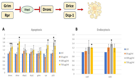 Expression of the pro-apoptotic genes rpr, drice, and dronc was significantly increased in two concentrations (100 and 750 μg/mL) compared to the negative control, indicative of the presence of an apoptotic stimulus, as confirmed also by the higher expression of p53, a cellular stress response gene. The apoptotic stimulus detected is probably consequent to gut damage shown in Figure 8. The PSNPs also seem to stimulate endocytosis, as shown by the upregulation of the two markers of the endolysosomal pathway, rab5 and rab7, in treated flies. Rab5 is a marker for early endosomes, replaced by Rab7 during maturation [62]. Although only the highest concentrations of PSNP result in significant differences, there is a general trend toward an increased expression of endocytic markers in all the treated samples, indicating that transmembrane transport may participate in PSNP uptake.