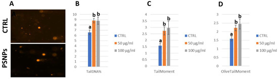 The Trypan Blue test was performed on third instar wild-type larvae to assess potential intestinal damage following PSNPs ingestion. Based on the extent of blue staining, the dissected guts were classified into five classes, from 0 to 4 (Figure 8A). A significant, though not drastic, increase in cell death was found at concentrations of 50 μg/mL and 750 μg/mL. To evaluate gut damage in adults, the Smurf assay was performed on w1118 flies fed with PSNPs. No significant results were recorded, but an interesting trend of smurf flies was found in both males and females, increasing with concentrations (Figure 8B). Considering the results, we continued to investigate the impact of PSNPs specifically on larval guts with the comet assay and qPCR on apoptotic gene expression.