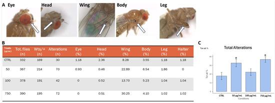 warts assay showing carcinogenic potential of PSNPS. (A) representative images of tumors in 3 days old wts defective flies (white arrows); (B) table resuming the percentage of masses in the wts fly population; (C), bar plot showing the percentage of total alterations. Treatment: CTRL (0 µg/mL); 50 µg/mL, 100 µg/mL, 750 µg/mL. * p < 0.05.