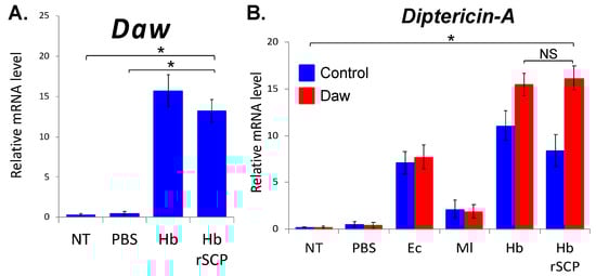 Heterorhabditis bacteriophora recombinant serine carboxypeptidase (rSCP) activates Activin and Imd signaling in Drosophila melanogaster. Injection of H. bacteriophora (Hb) rSCP into: (A). Daw (Activin pathway) is upregulated in w1118 background control flies (ANOVA, F = 1.222, * p < 0.05), (B). Diptericin-A (Imd pathway) is upregulated in Daw mutants (ANOVA, F = 1.137, * p < 0.05). Each experiment was repeated three times and each experimental condition involved approximately 30 adult (5–10 days old) flies. NT: Non-Treated flies; Time-point: 24 h; NS: Non-Significant. Error bars represent standard errors.