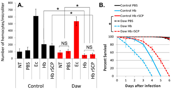 To explore the participation of TGF-β signaling in the cellular immune response and survival ability of D. melanogaster in response to entomopathogenic nematode infection factors, we have injected 7 ng of H. bacteriophora rSCP into w1118 flies (Control) and Daw loss-of-function mutant flies (line Pbac{XP}daw05680), and 24 h later we have recorded numbers of circulating hemocytes. We have counted substantially fewer hemocytes in Daw mutants compared to w1118 controls and compared to Daw mutants injected with PBS or non-treated individuals (Figure 2A). We also estimated the survival response of the two D. melanogaster lines to injection with H. bacteriophora rSCP and found that background control flies are able to survive the challenge, whereas Daw mutant flies succumb at 6 days post injection (Figure 2B). Also, as we have shown before [38], Daw mutant flies are more sensitive to H. bacteriophora nematode infection compared to background controls. These findings indicate that H. bacteriophora rSCP confers pathogenicity to D. melanogaster in the absence of Activin signaling, and Daw can regulate the hemocyte population in the adult fly during response to an entomopathogenic nematode infection factor.