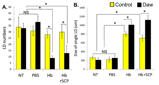 Increased intestinal steatosis in Activin-deficient Drosophila melanogaster. (A). Lipid droplet (LD) numbers decrease (ANOVA, F = 1.301, * p < 0.05), and (B). LD size increases (ANOVA, F = 1.107, * p < 0.05) in the gut of Daw mutant flies infected with Heterorhabditis bacteriophora (Hb) nematodes or injected with Hb recombinant serine carboxypeptidase (rSCP). The experiment was performed three times with each experimental treatment including in total 90 adult (5–10 days old) flies. NS: Non-Significant. Error bars represent standard errors.