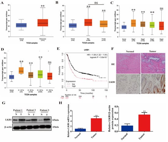 An analysis of the UALCAN database based on TCGA samples showed that, compared with normal samples, the expression of LKB1 in GC samples was greatly increased (p < 0.01, Figure 1A). In both male and female patients, LKB1 was highly expressed compared with the normal group (p < 0.01), but the difference in LKB1 expression between genders was not significant (Figure 1B). LKB1 continued to maintain a high expression from Stage 1 to Stage 3 compared with the normal group (p < 0.01). However, as the stage progressed, the level of LKB1 gradually decreased. By Stage 4, the LKB1 level was not significantly different from the normal group (Figure 1C). The expression of LKB1 was also related to the patient’s age. In GC patients aged between 21 and 40 years old, LKB1 was significantly more expressed than in the normal group (p < 0.01) and was higher than the levels of LKB1 in patients aged between 41 and 80 years old. However, the LKB1 level of GC patients in the 81- to 100-year-old range was not significantly different from the normal group (Figure 1D). An analysis of the prognostic contribution of LKB1 to GC patients through the Kaplan–Meier Plotter database showed that high expression levels of LKB1 predict shorter patient survival (p < 0.01, Figure 1E). An immunohistochemical (IHC) analysis of GC tumor tissues and adjacent normal tissues extracted from clinical patients proved that LKB1-positive staining increased significantly in GC tissues (Figure 1F). Protein and gene expression analyses of patients’ normal and GC tissues showed that, compared with adjacent tissues, the gene and protein levels of LKB1 in tumor sites were significantly increased (Figure 1G,H). These results indicate that a high expression of LKB1 is associated with the occurrence and progression of GC.