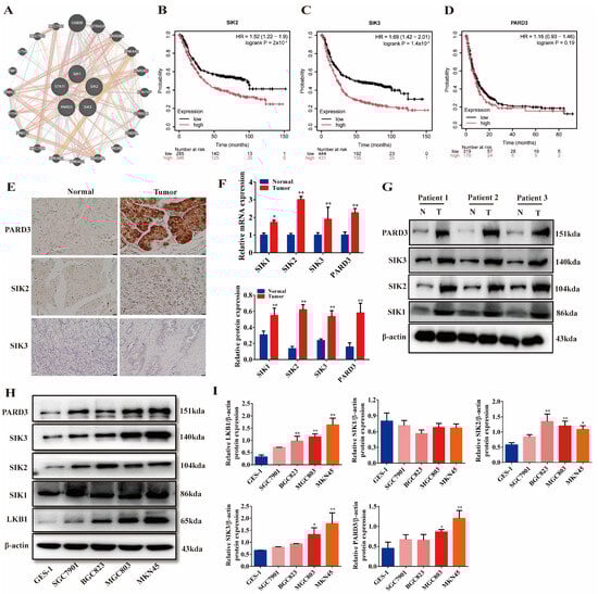 Association of LKB1 with SIK1−3 and PARD3 and their roles in GC. (A) The gene association network of LKB1, SIK1−3, and PARD3 was constructed using the GeneMANIA data portal. (B) Relationship between SIK2 expression and the survival curve of GC patients. (C) Relationship between SIK3 expression and the survival curve of GC patients. (D) The relationship between PARD3 and the survival curve of GC patients. (E) IHC staining of SIK2, SIK3, and PARD3 in paracancerous and GC tissues of GC patients (400×). (F,G) Differences in gene and protein expression levels of SIK2, SIK3, and PARD3 in paracancerous and GC tissues of GC patients (n = 3). (H,I) Differential protein expression of LKB1, SIKs, and PARD3 in four GC cell lines and GES-1. * p < 0.05, ** p < 0.01 indicates statistical difference compared to the normal group (F) or GES-1 group (I).