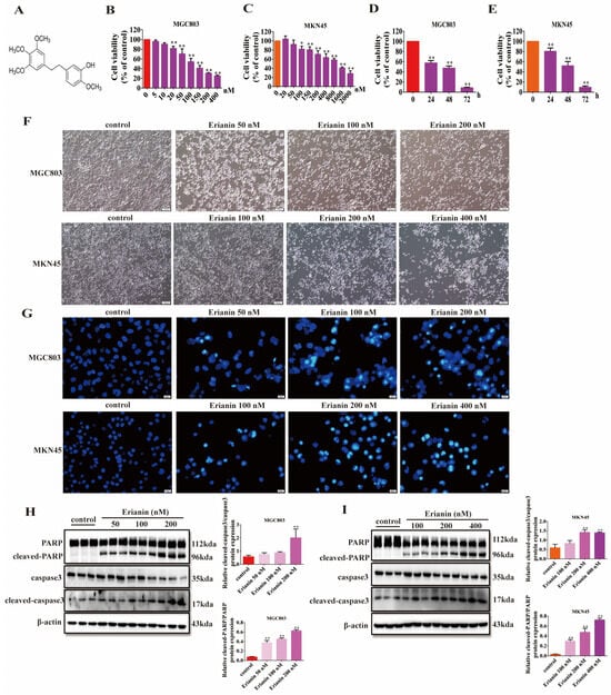 The chemical structure of Erianin is shown in Figure 3A. Erianin inhibited the viability of MGC803 cells in a dose-dependent manner (Figure 3B). When MGC803 cells were treated with 100 nM Erianin, their viability decreased over time (Figure 3D). A similar time-dependent reduction in cell viability was observed in MKN45 cells, although they were less sensitive to Erianin, requiring a higher concentration (200 nM) to achieve a comparable decrease in viability (Figure 3C,E). Morphological analysis revealed that treatment with Erianin (50–400 nM) for 24 h significantly altered the appearance of both MGC803 and MKN45 GC cells and inhibited their proliferation (Figure 3F). Hoechst 33342 staining further demonstrated that Erianin increased the number of apoptotic GC cells in a dose-dependent manner (Figure 3G). At the protein level, Erianin treatment led to a dose-dependently increase in the expression of cleaved-PARP and cleaved-caspase3, markers of apoptosis in the GC cells (Figure 3H,I). These results indicate that Erianin effectively inhibits the viability and proliferation of GC cells and promotes their apoptosis in a concentration-dependent manner.