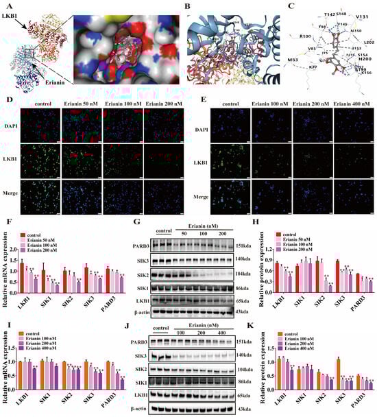 The CB-Dock2 online docking analysis revealed that Erianin had a good docking potential with a spatial of 3436 Å3. In its optimal docking conformation (docking center: X = −50, Y = −9, Z = 19), the affinity was calculated to be −8 kcal/mol (Figure 4A), with the docking size measuring: x = 27 Å, y = 31 Å, z = 21 Å. Erianin formed hydrogen bonds or hydrophobic interaction with the amino acid residues Ser154, Leu202, Met150, Ser148, Ile75, Phe415, and Ser199 surrounding the binding pocket of LKB1 (Figure 4B,C). Consistent with the docking data, Erianin significantly inhibited the fluorescent expression of LKB1 in both MGC803 and MKN45 cells (Figure 4D,E). In MGC803 cells, the gene expression of LKB1 was reduced in a concentration-dependent manner upon treatment with 50, 100, and 200 nM Erianin, with a significant decrease observed at 200 nM (p < 0.05). Additionally, the gene expression of the LKB1 downstream targets SIK2, SIK3, and PARD3 were all inhibited by Erianin to varying degrees (Figure 4F). At the protein level, Erianin inhibited the expression of LKB1 and PARD3 in a dose-dependent manner. Interestingly, the SIK family proteins showed differential responses to Erianin treatment. While SIK1 protein levels were largely unaffected, SIK2 and SIK3 were significantly inhibited at 100 nM Erianin (Figure 4G–K). These findings suggest that Erianin’s regulation of GC cells is primarily mediated through the inhibition of SIK2 and SIK3, rather than SIK1.