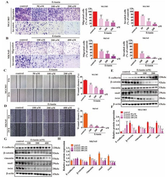 To evaluate the functional impact of Erianin on GC cells, we examined the migration, invasion, and scratch wound repair abilities of MGC803 and MKN45 cells after Erianin treatment. The results showed that Erianin effectively inhibits migration and invasion (Figure 5A,B), as well as wound healing (Figure 5C,D), in both cell lines in a concentration-dependent manner. Furthermore, Erianin treatment increased the protein levels of E-cadherin in a dose-dependent fashion. Conversely, the expression of β-catenin, vimentin, snail, and twist was reduced by Erianin in a concentration-dependent manner (Figure 5E–H). These findings indicate that Erianin could significantly inhibit the EMT characteristics of GC cells.