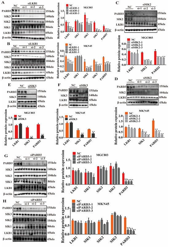 Silencing the expression of LKB1, SIKs, and PARD3 and their interaction. (A,B) Effects of silencing LKB1 expression on the expression of SIK1−3 and PARD3 in GC cells. (C,D) Effects of silencing SIK2 expression on the expression of LKB1 and PARD3 in GC cells. (E,F) Effects of silencing SIK3 expression on the expression of LKB1 and PARD3 in GC cells. (G,H) Effects of silencing PARD3 expression on the expression of LKB1 and SIK1−3 in GC cells. * p < 0.05, ** p < 0.01 indicates statistical difference compared to the NC group.