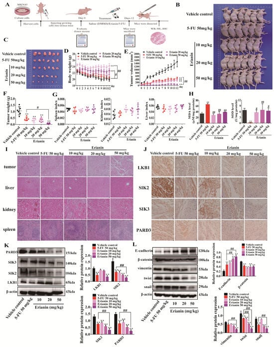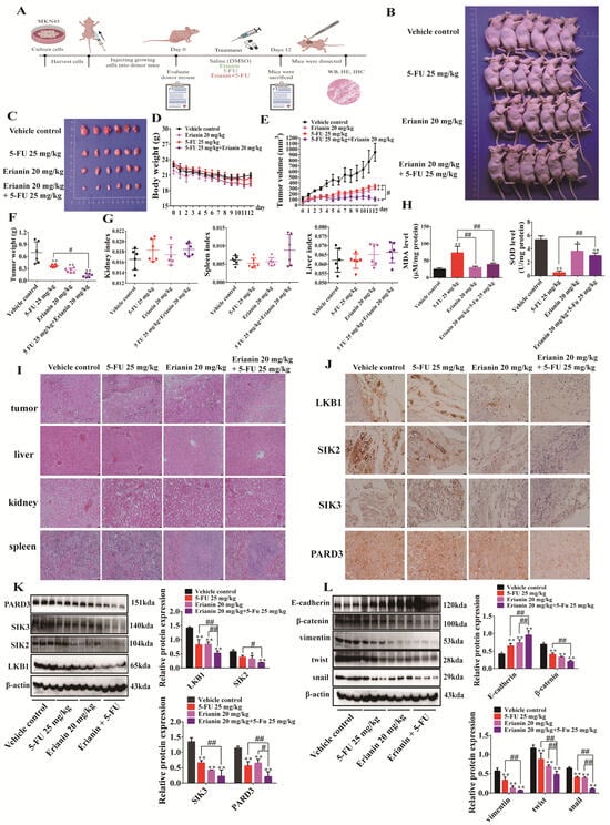 Erianin inhibits tumor growth and the expression of LKB1, SIK2, SIK3, and PARD3 in the CDX mouse model. (A) Schematic diagram of the CDX model construction and drug administration treatment strategy. (B) Axillary tumor growth of mice in the five groups. (C) The size of isolated tumors from mice in the five groups. (D) Body weight changes of mice in the five groups during the administration period. (E) Changes in tumor volume during the administration of mice in the five groups. (F) Tumor mass in the five groups of mice. (G) Liver, spleen, and kidney index of mice in each group. (H) Differences in liver MDA and SOD levels of mice in the five groups. (I) Representative photomicrographs of pathological staining of tumors, liver, spleen, and kidney tissues of mice in the five groups (200×). (J) IHC staining results of LKB1, SIK2, SIK3, and PARD3 in mouse tumor tissues in the five groups (400×). (K) Changes in protein expression of LKB1, SIK2, SIK3, and PARD3 in tumor tissues of mice in the five groups. (L) Changes in the expression of EMT marker proteins in tumor tissues of mice in the five groups. ** p < 0.01 indicates statistical difference compared to the vehicle control group. # p < 0.05, ## p < 0.01 indicates statistical difference compared to the 5-FU 50 mg/kg group.