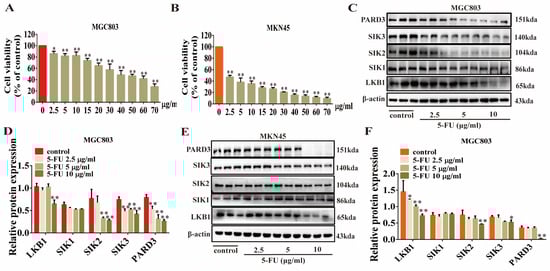 5-FU inhibits the expression of LKB1, SIK2, SIK3, and PARD3 in GC cells. (A) CCK8 assay showing the inhibitory effect of different concentrations of 5-FU on MGC803 cells. (B) CCK8 detected the inhibitory effect of different concentrations of 5-FU on MKN45 cells. (C,D) 5-FU inhibited the protein expression of LKB1, SIK2, SIK3 and PARD3 in MGC803 cells in a dose-dependent manner. (E,F) 5-FU inhibited the proteins expression of LKB1, SIK2, SIK3 and PARD3 in MKN45 cells in a dose-dependent manner. * p < 0.05, ** p < 0.01 indicates statistical difference compared to the control group.