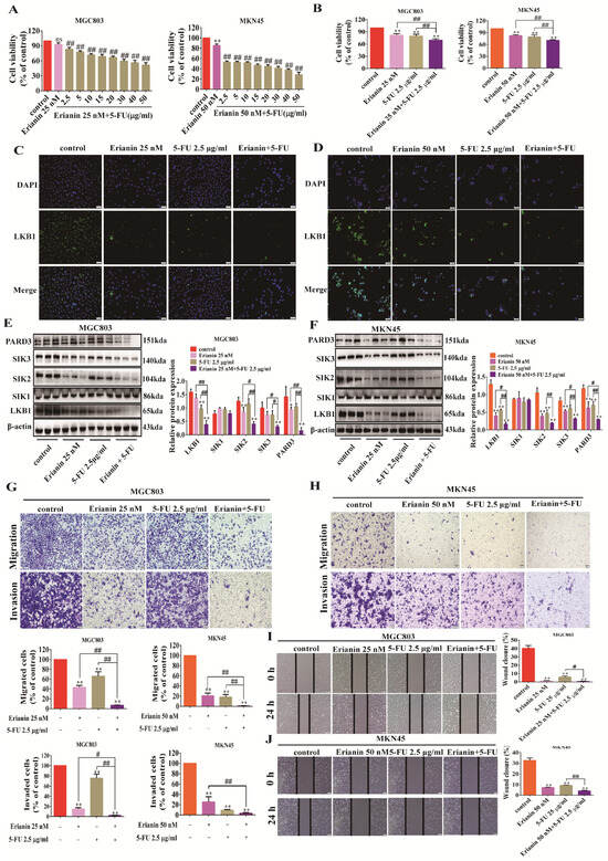 First, we chose to halve the concentration of Erianin and examined the inhibition of cell viability of GC cells by different combinations under a combination administration strategy, with 5-FU concentrations ranging from 2.5–50 μg/mL. The results showed that 2.5 μg/mL 5-FU combined with 25 nM Erianin could considerably inhibit the viability of MGC803 cells, while 2.5 μg/mL 5-FU combined with 50 nM Erianin could notably inhibit the viability of MKN45 cells (Figure 9A,B). Compared to 5-FU or Erianin alone, the combination of 5-FU and Erianin could significantly inhibit the fluorescence and protein expression of LKB1 both in MGC803 and MKN45 cells (Figure 9C–F). Furthermore, the combination also significantly inhibited the expression of SIK2, SIK3, and PARD3 (Figure 9E,F). In terms of cell function, the combination of 5-FU and Erianin inhibited cell migration and invasion better than either drug administration alone (Figure 9G,H). Similarly, the combination had a higher inhibition rate on the wound-healing ability compared to either drug alone (Figure 9I,J).