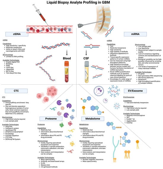 | EVs/Exosomes | Fast and relatively inexpensive Carry RNAs, proteins, and lipids, all of which are protected from enzyme degradation Able to cross an intact BBB Released by both normal and cancer cells | Lack of standardized methods for isolating EVs EVs are highly heterogeneous EVs have a short half-life (<30 min) Exosomes have a short half-life (<30 min) Released by non-neoplastic cells, resulting in a background of non-tumoral EVs in the blood Requires a high volume of blood Produces a low sample yield |