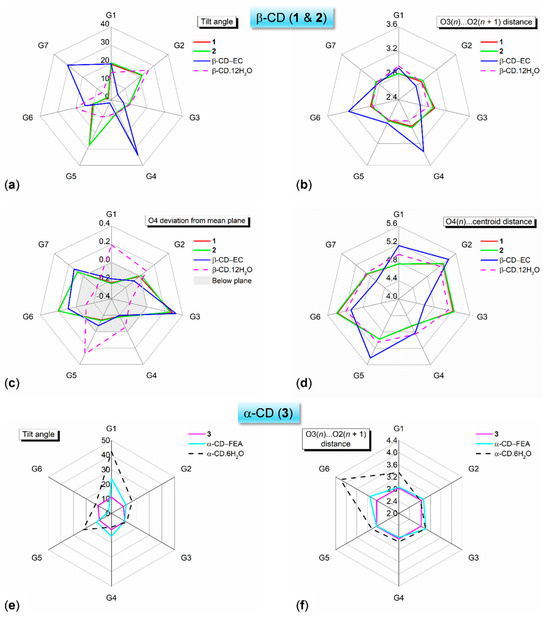 Radar plots showing the variations in (a,e) tilt angles, (b,f) O3(n)⋯O2(n + 1) distances, (c) O4(n) deviations, and (d) O4(n)⋯centroid distances in the glucose units G1–G6/G7 of α-/β-CD upon complexation with TRM base (1) and TRM HCl (2,3). For comparison, data from the inclusion complexes β-CD–(–)-epicatechin(EC) [14], α-CD–ferulic acid(FEA) [6], and the uncomplexed β-CD·12H2O [23], α-CD·6H2O [24] are included, and their glucose units are renumbered for the best fit; see also Table S1. In (c), the gray area indicates that the glucose units have O4 below their mean plane (negative values). Angles and distances are in ° and Å.