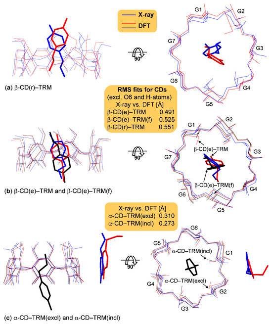 Structure superpositions of (a) β-CD(r)−TRM, (b) β-CD(e)−TRM and β-CD(e)−TRM(f), and (c) α-CD−TRM(excl) and α-CD−TRM(incl) complexes derived from X-ray analysis (blue lines) and DFT full-geometry optimization in the gas phase (red and black lines); see also Figure 6 and Tables S5–S7. The rms fits are calculated for non-H atoms of the CD skeletons, excluding TRM.