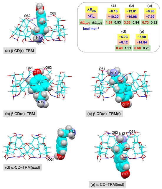 DFT-optimized structures of inclusion complexes (a) β-CD(r)−TRM, (b) β-CD(e)−TRM, (c) β-CD(e)−TRM(f), (e) α-CD−TRM(incl), and exclusion complex (d) α-CD−TRM(excl), shown only from side view; see also Figure 5 and Figure S1. The stabilization, interaction, and deformation energies (ΔEstb, ΔEint, ΔEdef1, and ΔEdef2) are summarized in the inset; see also Tables S5–S7. The intramolecular O–H∙∙∙O H-bonds within CDs and intermolecular N/O–H∙∙∙O/N H-bonds and O–H∙∙∙π interactions are indicated by blue and magenta connecting lines, respectively. The intramolecular, interglucose C6–H···O5 H-bonds and host–guest C–H···O/N interactions are not shown (Tables S5 and S6).