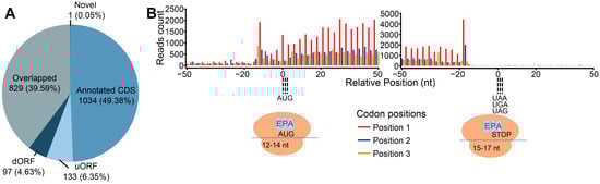 Genomic distribution, length, and 3 nt periodicity of identified ribosome-protected fragments (RPFs): (A) Distribution of RPFs across different features of the maize genome. Annotated coding sequences (CDSs), upstream open reading frame (uORF), downstream ORF (dORF), overlapped ORF, and novel coding regions are indicated with different colors. The numbers out and in parentheses indicate the gene number and the percentage of total reads, respectively. (B) Meta-gene analysis of the 29-nucleotide (nt) RPFs near the annotated translation start and stop sites in the maize genome. The red, blue, and orange bars represent the three possible open reading frames. E, P, and A indicate the aminoacyl-tRNA entry site, the P-site (peptidyl-tRNA formation site), and the E-site (uncharged tRNA exit site) in ribosomes, respectively. The numbers in the drawn ribosomes indicate the number of nucleotides protected by ribosomes upstream of the start codon and downstream of the stop codon.