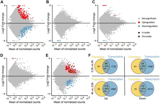 To assess the dynamics of translational regulation in response to light, we looked for differentially translated genes (DTGs) from four pairwise comparisons (0–0.5 h, 0.5–1 h, 1–2 h, 2–4 h, and 0.5–4 h). We discovered that translational regulation mainly occurs during the 0–0.5 h period, as the number of DTGs dramatically decreased for the later comparisons (Figure 2A–E). The shift from darkness to light is an abrupt environmental change for seedlings; the large number of DTGs at the earliest time point reflected the prompt responses of translational regulation to cope with sharp environmental fluctuations. This observation is in line with the idea that translational regulation is fast and can respond to environmental signals quickly [31]. Although the pairwise comparisons between 0.5 and 1 h, 1 and 2 h, and 2 and 4 h periods yielded no DTGs, the comparison of 0.5–4 h resulted in many DTGs, which may be attributed to a stable environment that led to a slow accumulation of gene expression changes (Figure 2E).